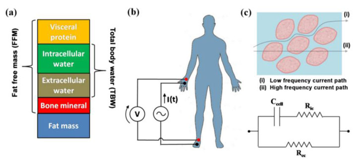 Sabendo-se que a corrente elétrica é melhor conduzida pelos íons contidos nos fluidos, é possível determinar a quantidade de água corporal, geralmente expressa em porcentagem.